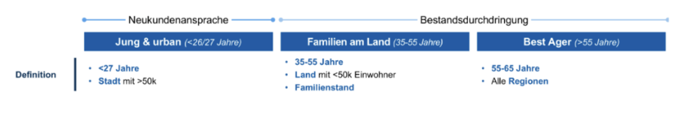 Wir konnten drei entscheidende Kundengruppen mit Handlungspotenzial identifizieren, in denen UNIQA bislang noch unterrepräsentiert ist oder ein hohes Potenzial zur Kundenvertiefung ausgeschöpft werden kann. Genau darin sehen wir eine Chance, gemeinsam mit unseren Geschäftspartner:innen noch gezielter zu wachsen, neue Kund:innen zu gewinnen und bestehende Beziehungen zu intensivieren – durch maßgeschneiderte Angebote, relevante Ansprache und eine konsequente Ausrichtung auf die Bedürfnisse dieser Zielgruppen.